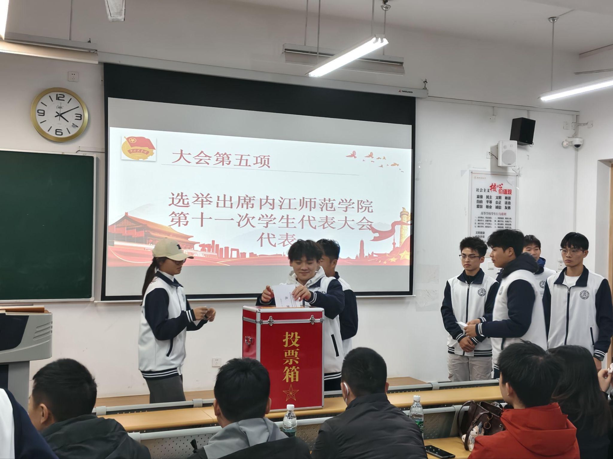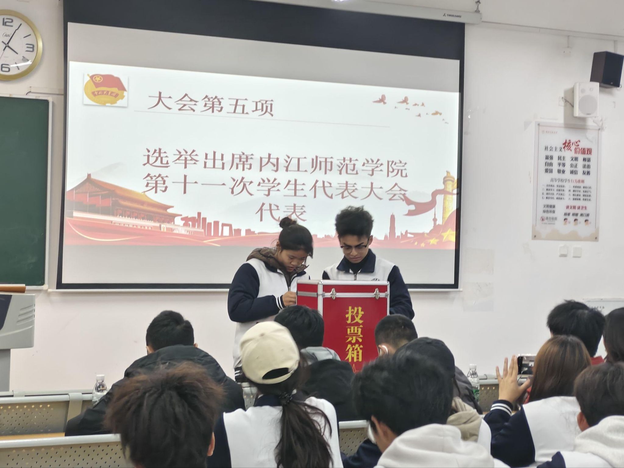 在选举出席内江师范学院第十一次学生代表大会代表环节,大会严格按照选举流程,经过清点到会人数、检查票箱、发放选票、代表填写与投票、开箱计票等环节,最终选举产生了王禹、刘小渝、朱可、罗鑫、马海日里、邓先悦、刘俊林、陈旭、郑琳丽、谢霞共10名代表。选举过程公开透明,充分体现了民主选举的原则。
