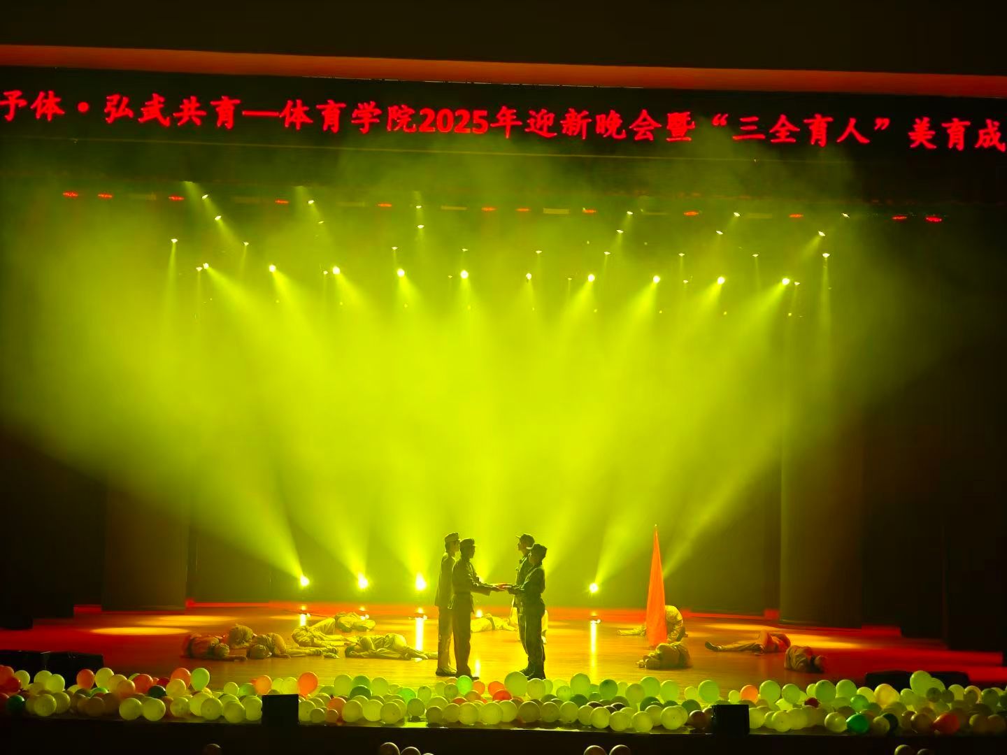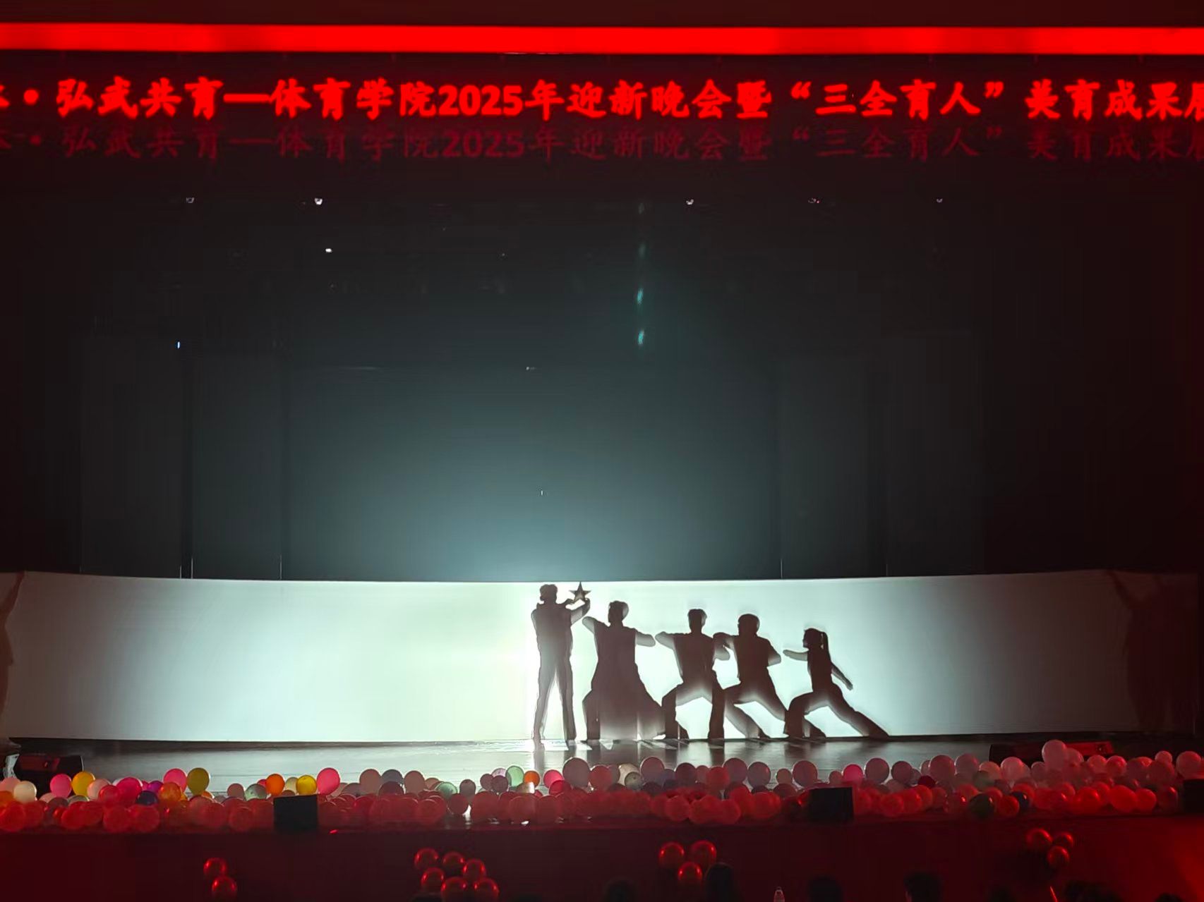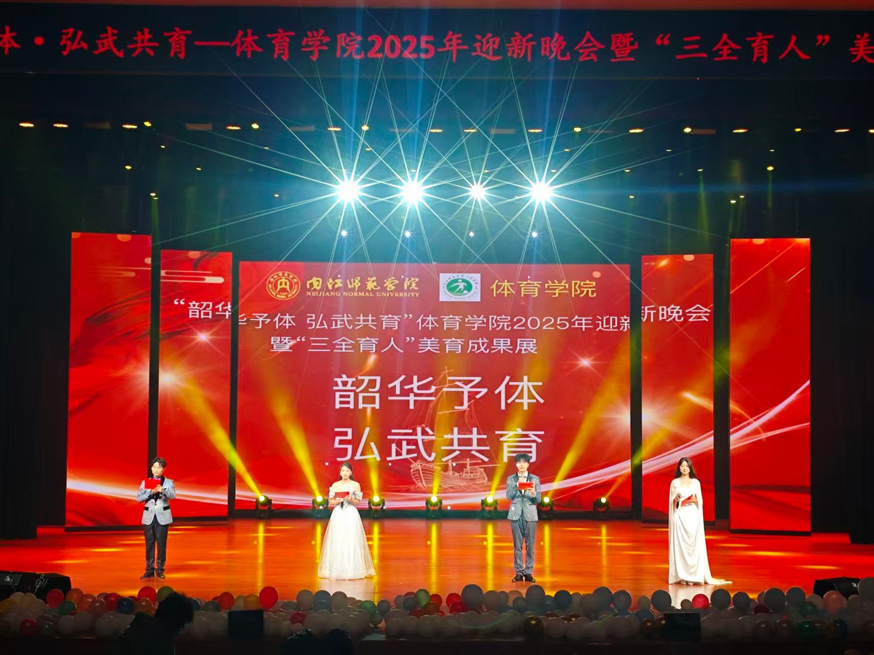 青春如歌,唱响时代新声;武魂铸魂,彰显体育风采。为传递学院“韶华予体 弘武共育”及“三全育人”理念,彰显美育成果与学子精神风貌。2025年12月12日晚,“韶华予体 弘武共育”——体育学院2025年迎新晚会暨“三全育人”美育成果展在学校苌弘剧院隆重举行。体育学院党委书记李才宝,党委副书记、纪委书记吴昊、副院长申向军、副院长李达伟等领导嘉宾,校团委学生会及各二级学院团委、学生会代表与体育学院全体师生齐聚一堂,共同见证这场融合体育精神与美育文化的视听盛宴。