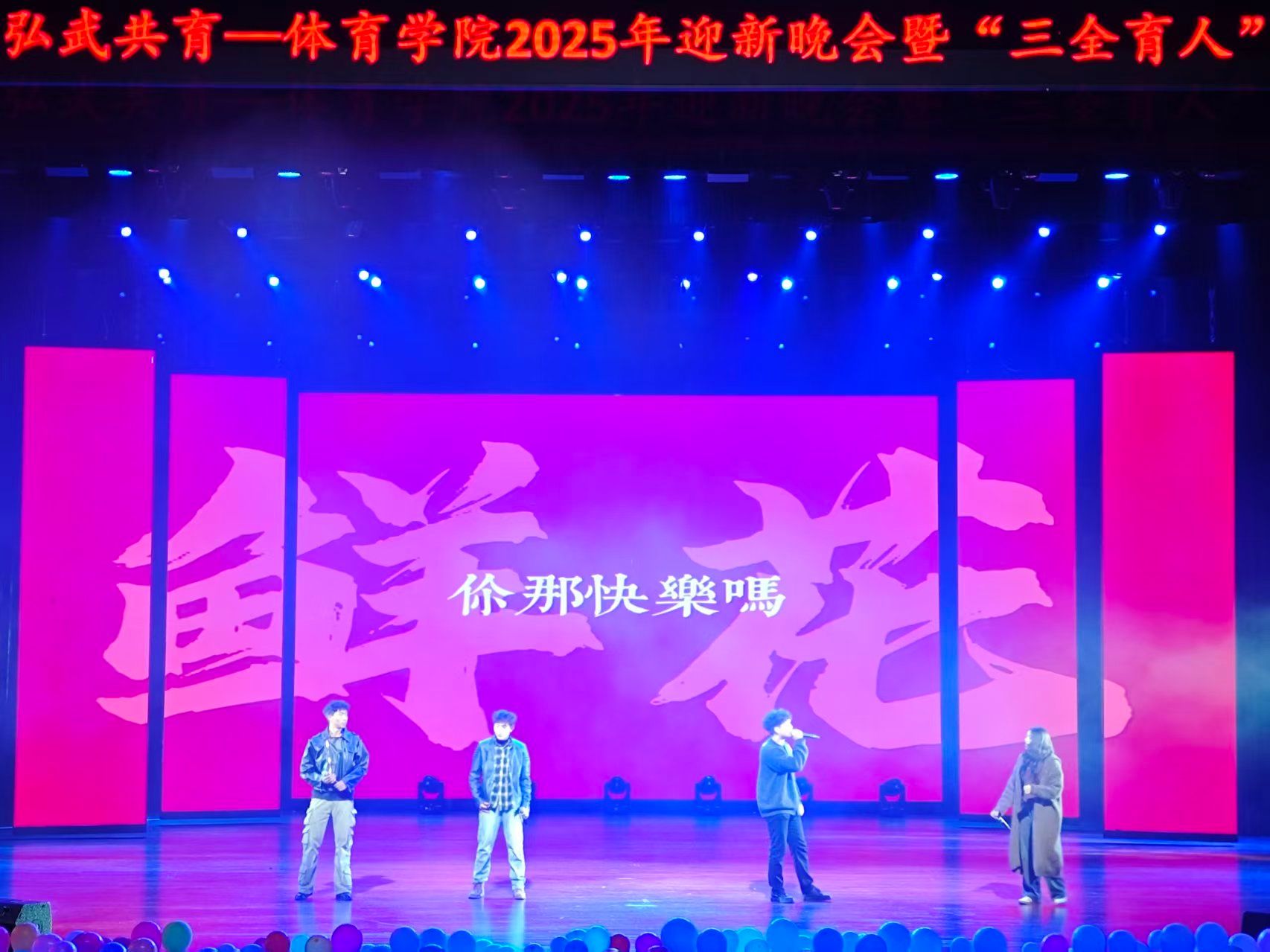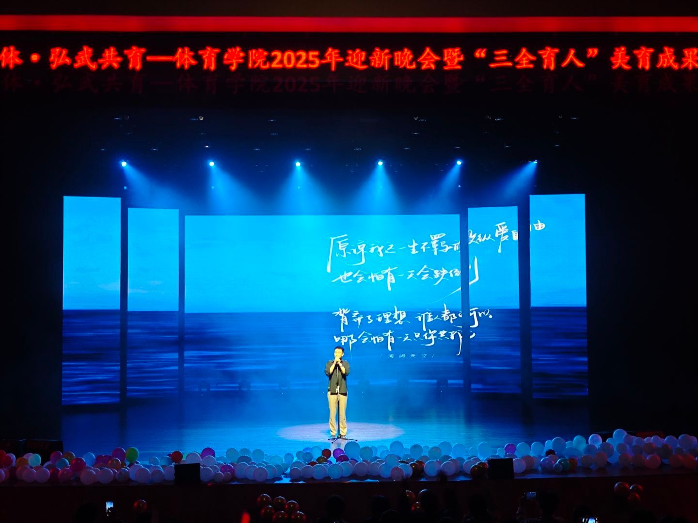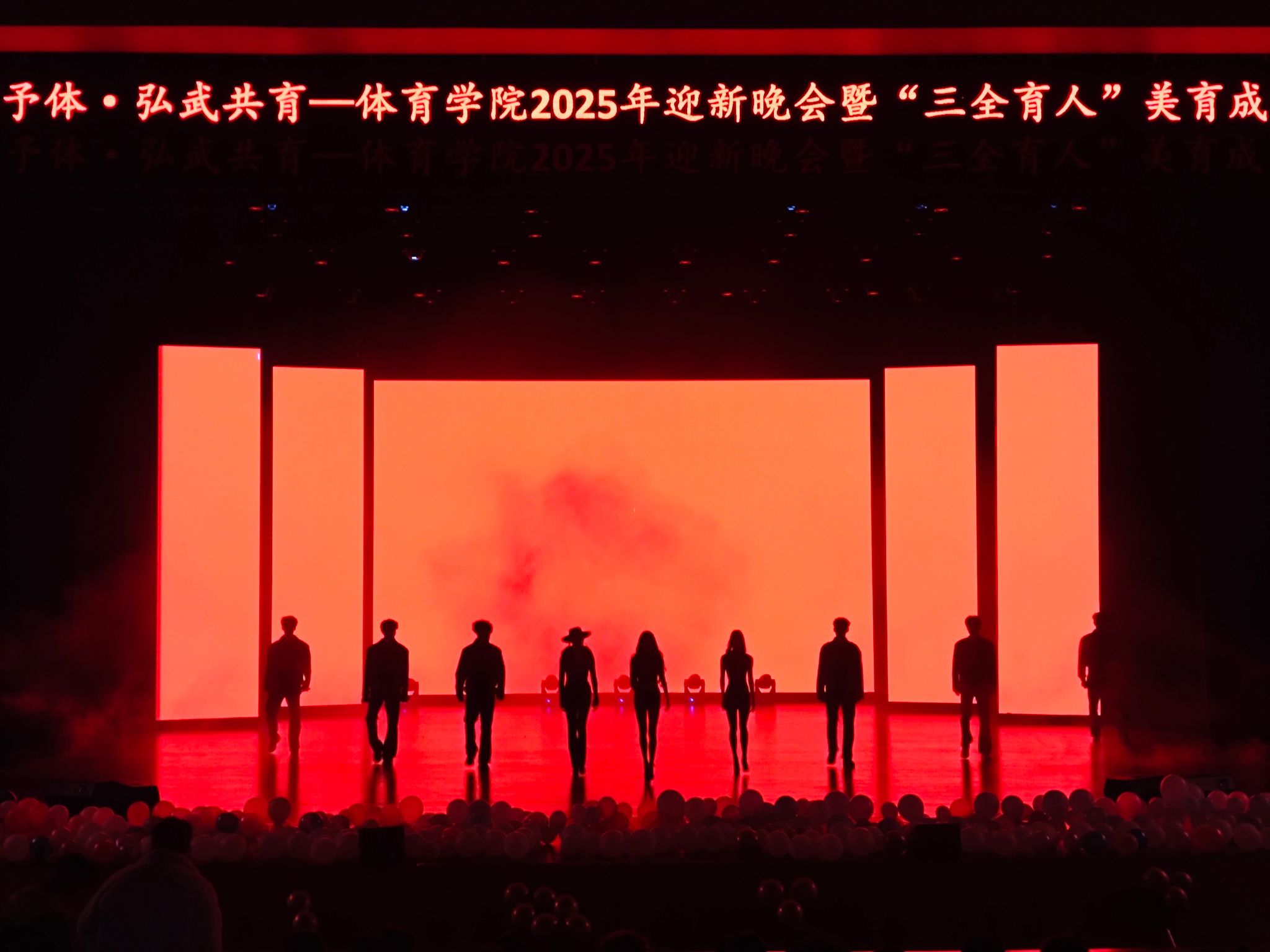 青春如歌,唱响时代新声;武魂铸魂,彰显体育风采。为传递学院“韶华予体 弘武共育”及“三全育人”理念,彰显美育成果与学子精神风貌。2025年12月12日晚,“韶华予体 弘武共育”——体育学院2025年迎新晚会暨“三全育人”美育成果展在学校苌弘剧院隆重举行。体育学院党委书记李才宝,党委副书记、纪委书记吴昊、副院长申向军、副院长李达伟等领导嘉宾,校团委学生会及各二级学院团委、学生会代表与体育学院全体师生齐聚一堂,共同见证这场融合体育精神与美育文化的视听盛宴。