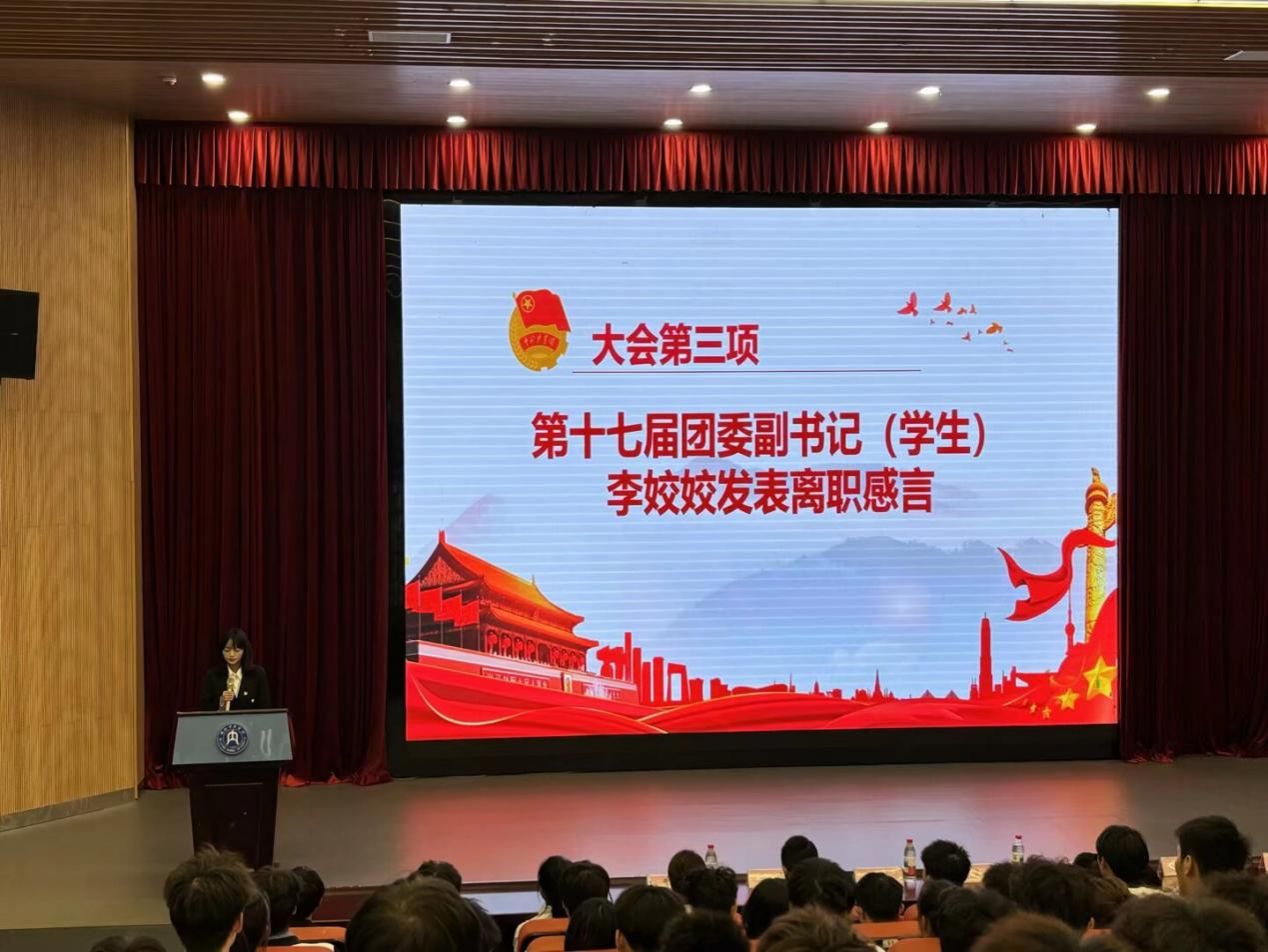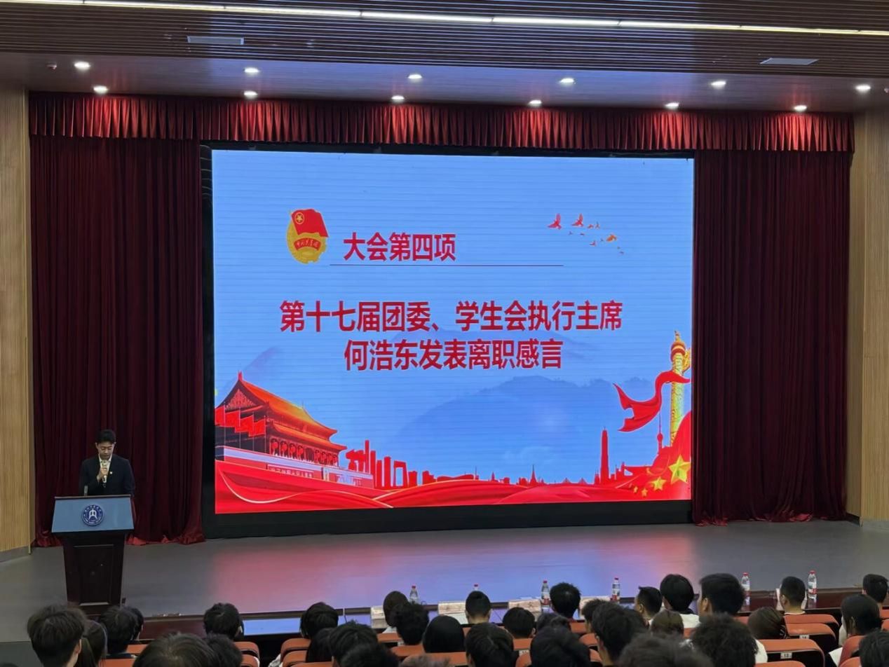 换届仪式在庄严的国歌声中拉开帷幕。第十七届团委副书记李姣姣、执行主席何浩东依次发表离职感言。二人结合任职经历,分享了服务学院中心工作、助力同学成长的具体案例与工作感悟,既回顾了过往工作的成果与挑战,也为新一届成员提供了 “注重协作”“贴近同学需求” 等实用经验,真挚的发言赢得现场阵阵掌声。