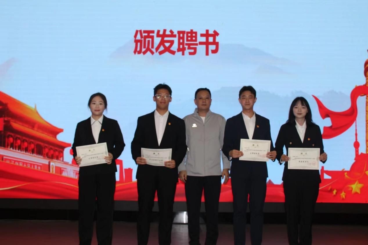 聘书颁发环节。学院党委书记李才宝为主席团成员颁发聘书,党委副书记、纪委书记吴昊和团委副书记王应共同为各部门主要负责人颁发聘书,学工办李鹏、李鹏辰为次要负责人及相关岗位成员颁发聘书。