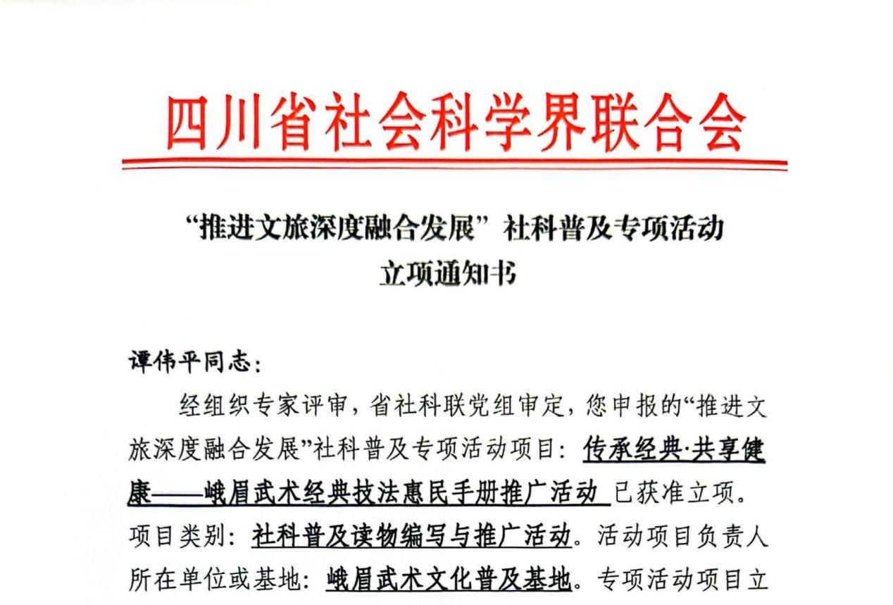 近日,从四川省社会科学界联合会传来喜讯:内江师范学院教育部中华优秀传统文化峨眉武术传承基地(依托“峨眉武术文化普及基地”)谭伟平教授团队申报的“传承经典・共享健康 —— 峨眉武术经典技法惠民手册推广活动”,成功获批四川省社科联“推进文旅深度融合发展”社科普及专项活动立项。